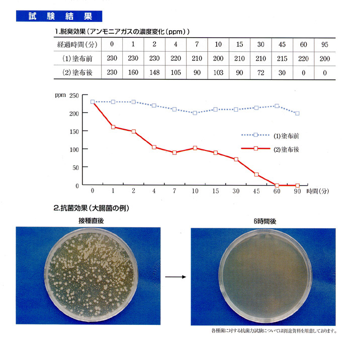 下記はアンモニアガスに対する脱臭テスト、及び大腸菌に対する抗菌性のテスト結果です。 アンモニアガスは60分で検知しなくなりました