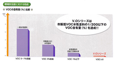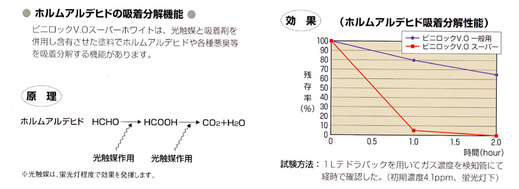 ビニロック V.Oシリーズは、共通の特長である低VOC、超低臭はもちろんのこと、さらに特殊光触媒によるホルムアルデヒドの吸着分解機能やアンモニアなどの消臭機能を付与した高級品(ビニロックV.Oスーパー)も用意しています。